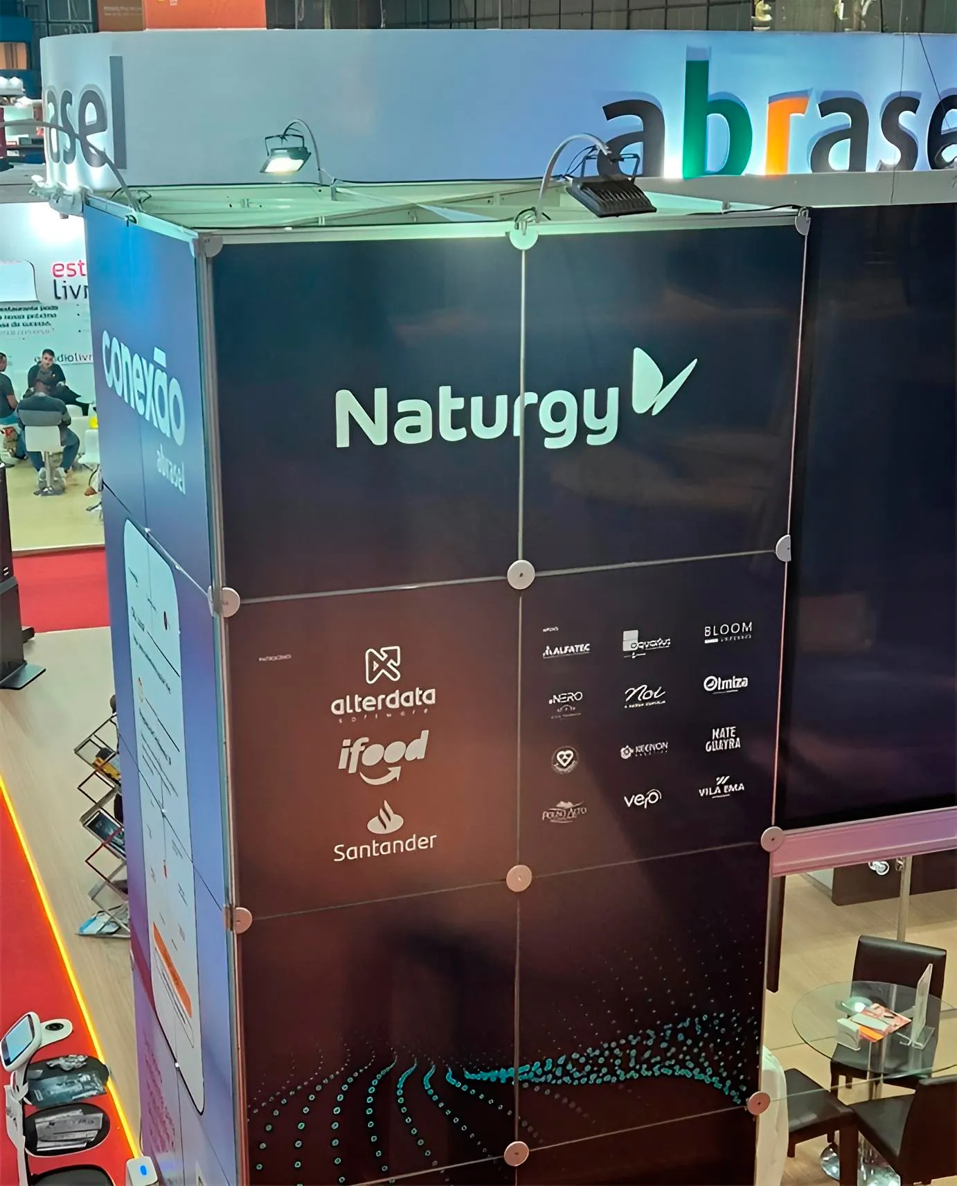 Além disso, conhecemos o stand na feira, onde foi apresentado soluções para os empreendimentos em conjunto com os patrocinadores Naturgy, Santander, Alterdata e iFood.